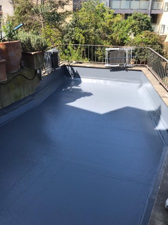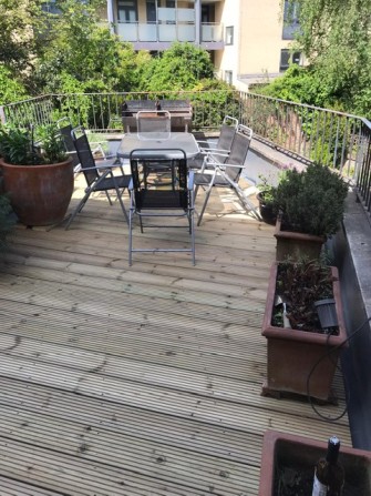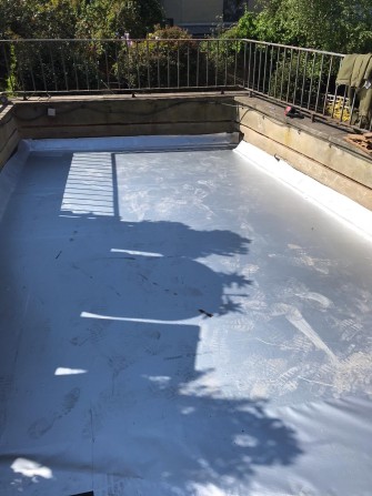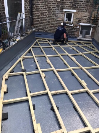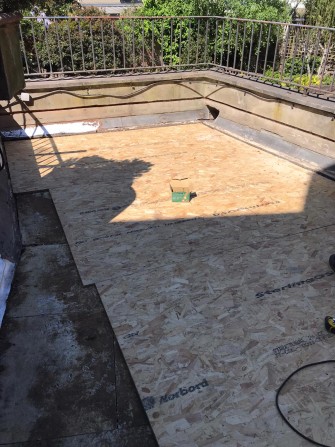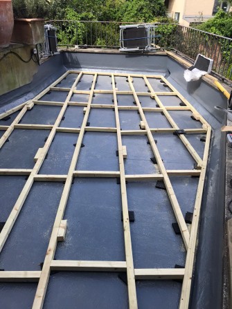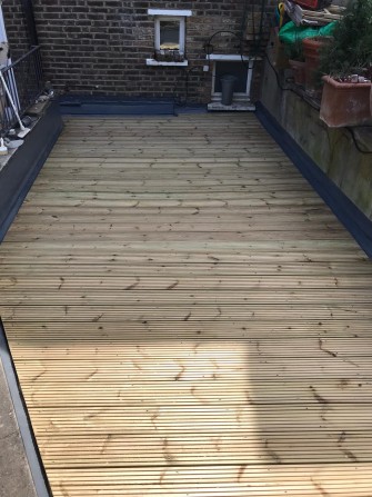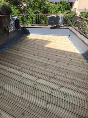 We hacked up the existing roof coverings and cleared from site. We laid new ply decking to take the new Sika Coatings. We then cleaned, primed and laid Sikalastic 625 on the roof. We used liquid coatings as they are completely seamless and when prepared and applied to the product’s instructions they are guaranteed to waterproof, protect and enhance most flat or pitched roofs. We supplied and laid a timber framework to take the new decking. The timber framework was set on 10mm support pads to allow water flow underneath. We then laid new timber decking fixed to the framework.