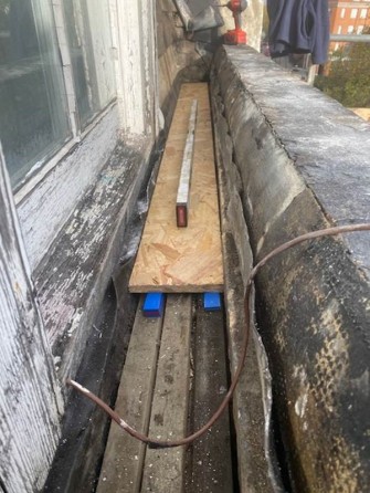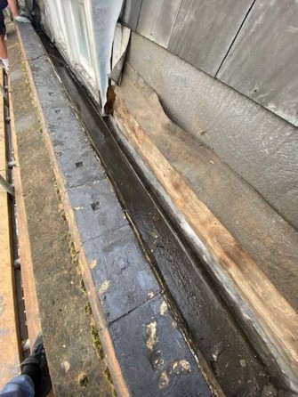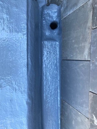 We renewed the gutter coverings and refalled the existing gutter, this was so the water flowed to the gutter outlet and did not pool in the gutter. We then laid Sika Liquid Plastic coatings.